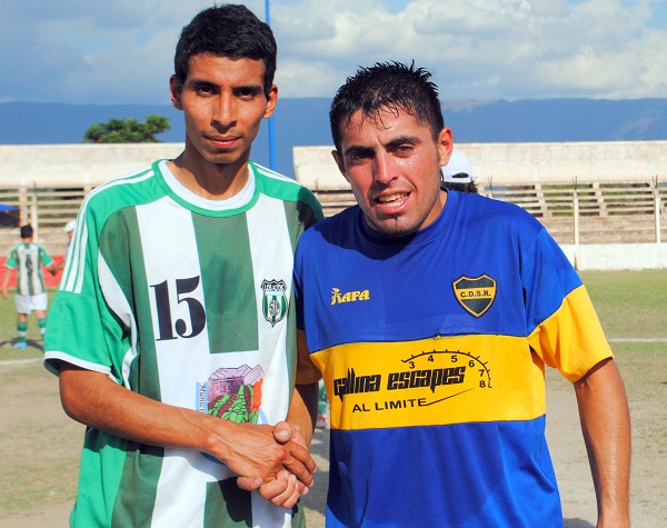 En las fotos, los protagonistas del gol en el partido excluyente que tuvo esta tarde el ascenso chacarero: Gastón Barrionuevo (LA) y Julio Prida (SR), ambos satisfechos con la igualdad y sus goles, en una tarde infernal en Tres Puentes (jugaron entre las 3 y las 5 de la tarde, con casi 40° de temperatura).