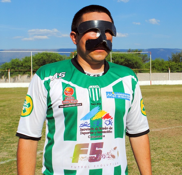 En la foto, el delantero “santo” Luis “Luchino” Romano, que ayer volvió a jugar con una máscara en su rostro para cubrir la zona de la seria lesión que le provocara el defensor de Independiente, Walter Bazán, veinte días atrás, cuando con un fuerte codazo le causara una quíntuple fractura del tabique nasal. Romano, ratificó al respecto que planteó la correspondiente denuncia sobre el hecho en el precinto 11mo. de la Policía Judicial.