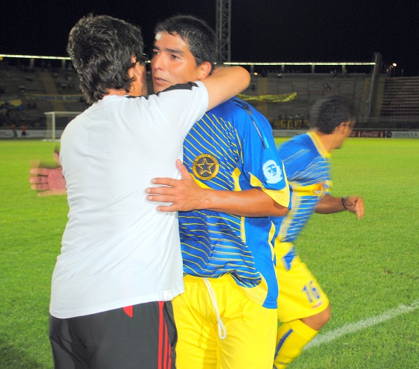 En las fotos, el abrazo de Chazarreta felicitando al “Vica” Luján por su gol, Balmaceda al ser retirado por la camilla móvil y el árbitro Infante al salir de la cancha custodiado por la policía.