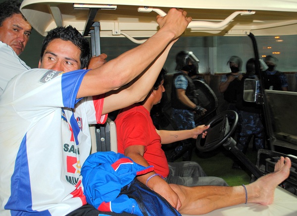 Infante y sus asistentes, como los jugadores visitantes debieron salir custodiados por la policía, para evitar los efectos de la fuerte reacción que se generó en la platea, en tanto que el técnico “auriazul” Andrés Chazarrea y sus jugadores intentaban calmar los ánimos para evitar que los hechos pasen a mayores.