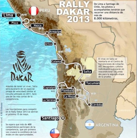 Como en 2012, serán tres los países que alberguen el prestigioso rally, Perú, Argentina y Chile, para un recorrido de catorce etapas, en el que se cruzará dos veces la cordillera de los Andes (una de ellas por el Paso de San Francisco, Catamarca, el 17 de enero) y donde estará de vuelta en la categoría de autos el piloto español Carlos Sainz, tras un año de ausencia.