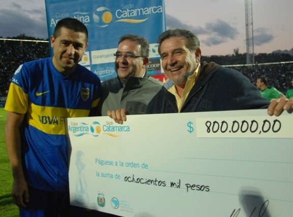 El emblema del conjunto de Julio César Falcioni, protagonista en el partido frente a Santamarina de Tandil por los 32avos. de Final (asistencia en el gol de Facundo Roncaglia y penal convertido en la definición) y decisivo en el choque frente a Deportivo Merlo por la Semifinales (gol de tiro libre y penal de la clasificación), en Catamarca, confirmó la importancia que le dio el grupo a todo lo que todo está en juego: “Para nosotros son importantes los tres torneos. A partir de hoy y hasta el jueves lo más importante es la Libertadores, y luego, hasta el domingo, será el campeonato”, sostuvo Riquelme, en la foto cuando recibió el cheque simbólico por 800 mil pesos, de manos del intendente de Catamarca, Raúl Jalil, y el gobernador de La Rioja, Beder Herrra, por la clasificación lograda en el estadio “Bicentenario” de nuestra provincia.