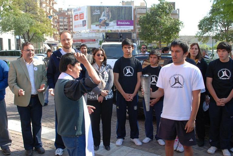 La ceremonia había iniciado en el Paseo de la Fe, donde la gobernadora Lucia Corpacci, funcionarios y alumnos participaron de la bendición de la llama votiva, que luego se trasladó vía terrestre hasta el Polideportivo “FME” para el encendido del pebetero que inauguró la competencia. Precisamente, la estudiante y deportista Micaela Corner fue la encargada de encender la llama.