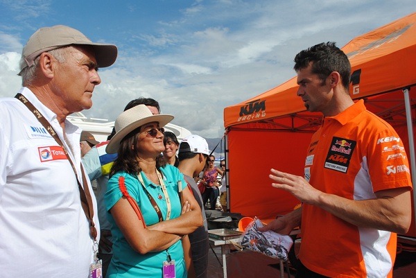 En la foto, el ministro de Turismo, Enrique Meyer, junto a la gobernadora de Catamarca, Lucía Corpacci y el francés, Cyril Despres, que lidera la clasificación general en la categoría de las motos.