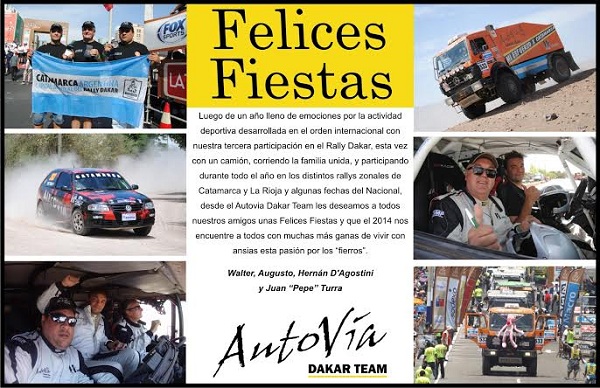 “Luego de un año lleno de emociones por la actividad deportiva desarrollada en el orden internacional con nuestra participación en el Rally Dakar, esta vez con un camión, corriendo la familia unida, y participando durante todo el año en los distintos rallies zonales de Catamarca y La Rioja y algunas fechas del Nacional, desde Autovía Dakar Team les deseamos a todos nuestros amigos unas Felices Fiestas y que 2014 nos encuentre con muchas más ganas de vivir con ansias esta pasión por los fierros”.