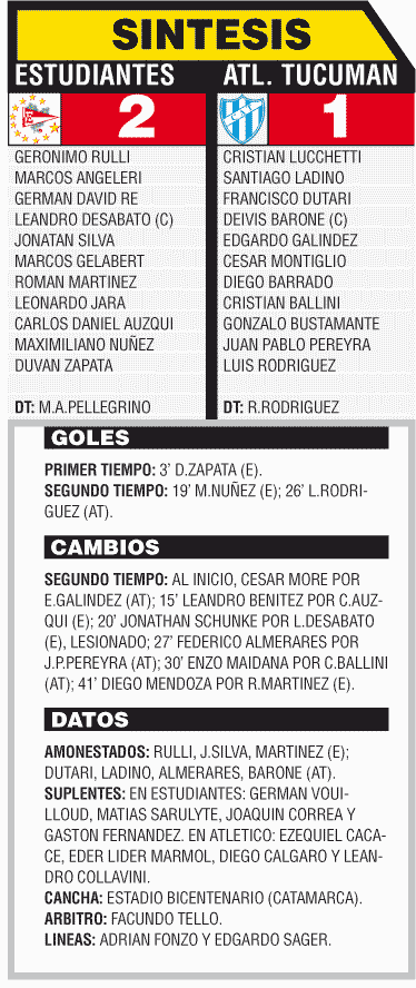 De flojo presente en el torneo Final de la AFA, el “Pincha” le ganó con lo justo 2-1 a Atlético Tucumán, y accedió a los 8vos. de final, donde enfrentará a Quilmes (eliminó a Unión Villa Krause, de San Juna). El colombino Duvan Zapata (3PT), figura del encuentro, y Maximiliano Núñez (18ST), marcaron para los de La Plata; mientras que Luis “La Pulga” Rodríguez (24\'ST) descontó para los tucumanos.