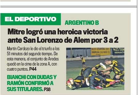 Y Nuevo Diario publicó que “Mitre consiguió un triunfazo y sobre la expiración del juego, al vencer como local al duro San Lorenzo de Alem de la provincia de Catamarca por 3 a 2”.