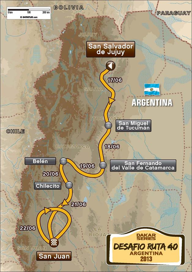 Luego de largar desde la ciudad de San Salvador de Jujuy, el Desafío Ruta 40 tendrá sus campamentos en las ciudades de San Miguel de Tucumán, San Fernando del Valle de Catamarca, Belén, Chilecito y San Juan, ciudad donde se realizará la coronación de los ganadores el sábado 22 de junio próximo.