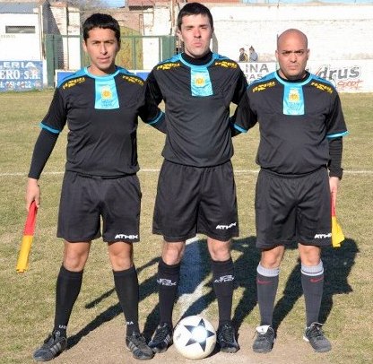 En la foto, el árbitro Lautaro Agustín Andreis (centro), junto a Leonardo Villamil que será uno de los asistentes, y Gabriel Spinella el 4to. árbitro, que ya dirigieran a Dep. Roca, en otros partido por el Argentino B, en el sur del país.