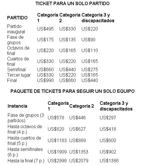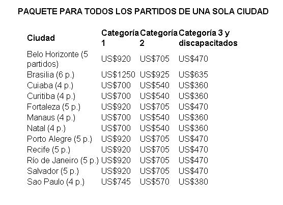 En la Categoría 1, que cuenta con las ubicaciones de mayor privilegio en cada estadio, la entrada del partido inaugural en San Pablo cuesta US$495, contra los US$990 que sale un boleto para la final del 11 de julio en el estadio Maracaná. El paquete para seguir en su totalidad a una selección, por ejemplo: Colombia. Va desde US$578 por los tres partidos de la fase de grupos, hasta los US$2998 en caso de comprar los siete partidos. Los tickets de Categoría 2, 3 y discapacitados, generalmente detrás de los arcos, son más accesibles. Aunque serán los que más entrarán en el bolillero. Un boleto en esas categorías se conseguirá a un valor de entre US$90 y US$135 por partido en la fase de grupos. Y en el partido final saldrá US$440 y US$660.