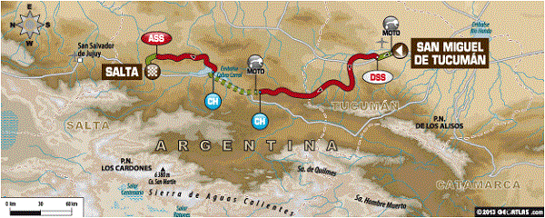 Mientras, desde las 6 de hoy, ha comenzado la 6ta. etapa entre Tucumán y Salta, para la primera moto, la de Marc Coma, líder actual de la clasificación general, lanzándose al tramo de enlace en dirección al sector cronometrado. En total son 92 motos y 20 quads los vehículos autorizados para disputar hoy la carrera, entre ellos el piloto catamarqueño Diego Demelchori, que viene 36° en la clasificación general de su categoría