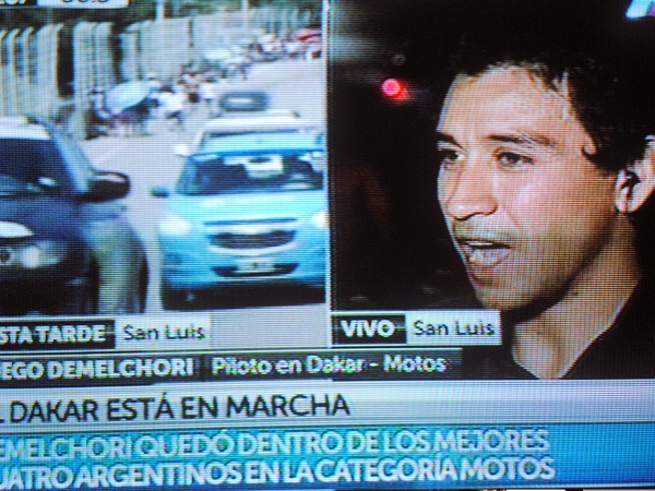 Distendido, muy locuaz y con excelente estado de ánimo se observó esta noche por la señal nacional de cable TN al corredor catamarqueño Diego Demelechori, hablando desde San Luis, donde hoy completó la 1ra. etapa del singular raid internacional. Como novedad, informó que además de los puestos 56° de la general y 4° entre los argentinos, se ubicó en el 7mo. puesto de la especialidad “Maratón”, incorporada en esta nueva edición del Dakar.