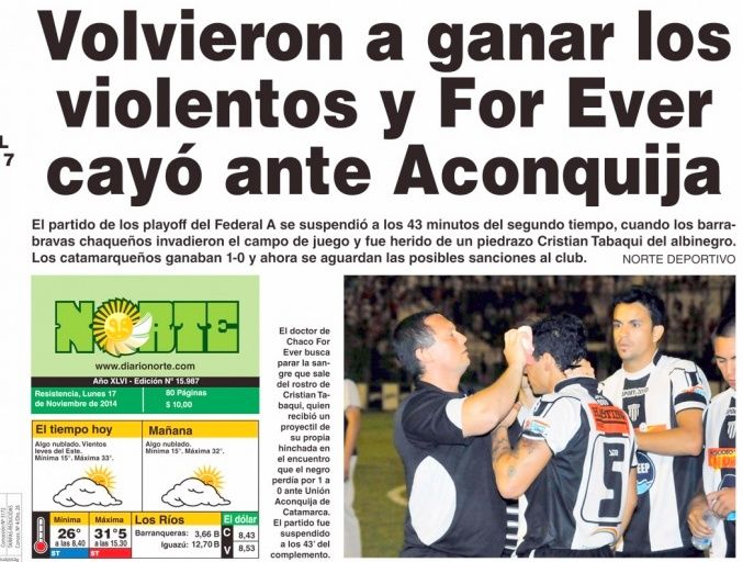 Finalmente hace referencia a la culminación, contando que "a falta de minutos para la finalización del partido, el árbitro principal Pablo Echavarría dio por suspendido el partido por invasión y agresión de parte del público local a los jugadores de ambos clubes. La revancha será el próximo sábado en Catamarca y For Ever tendrá que dar vuelta el resultado si quiere avanzar de fase en el Torneo Federal A”, terminó la crónica de Norte.