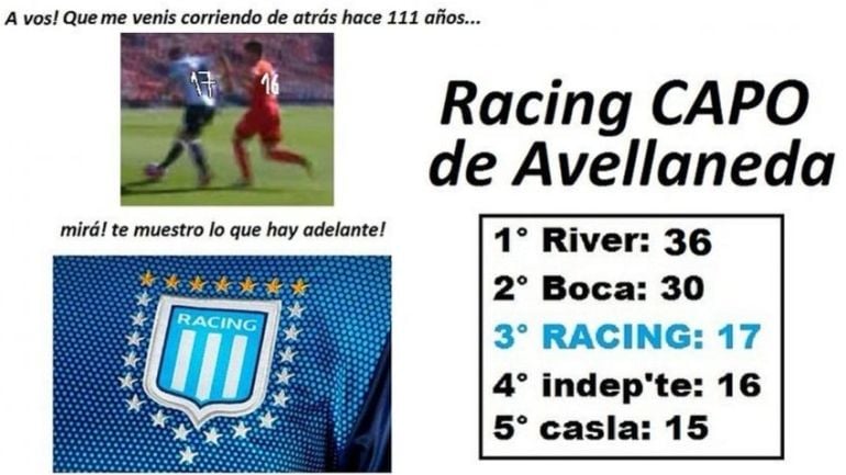Pese a esto, nada pudo desenfocar a la 'Academia' de su obsesión y cumplió con su objetivo: venció 1 a 0 a Godoy Cruz y se consagró en el certamen local. Tras este desahogo, nada demoraron los fanáticos del elenco de Avellaneda en acordarse de sus 'vecinos' y dedicarles los ya clásicos afiches virtuales.