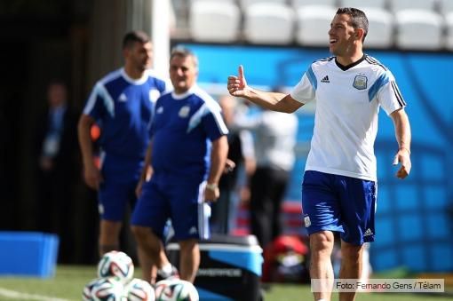 Si bien apenas se pudieron ver oficialmente los primeros 15 minutos de la práctica realizada a manera de reconocimiento en el estadio Arena Corinthians de San Pablo, con algunos movimientos físicos y con pelota, luego trascendió que el director técnico, Alejandro Sabella, dispuso un ensayo de fútbol con la variante mencionada. En la conferencia de prensa previa, el entrenador reconoció que Lavezzi le permitía pasar de un 4-3-3 a un 4-4-2 sin necesidad de cambiar a un jugador, pero minutos después en la práctica probó con la `Fiera` Rodríguez como volante por derecha.