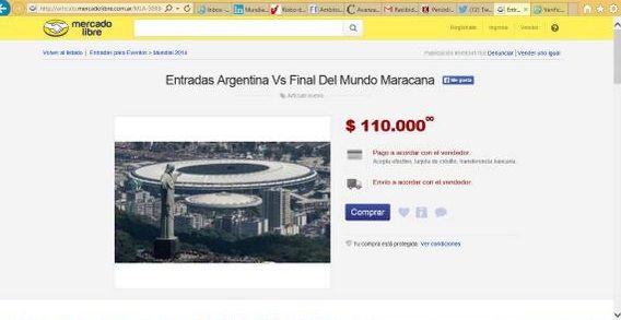 En Mercado Libre, el popular sitio de comercialización en Internet, apareció una publicación que ofrece una entrada para ver la final de la copa del mundo entre Argentina y Alemania, a nada más y nada menos que $110.000.