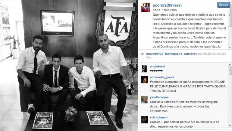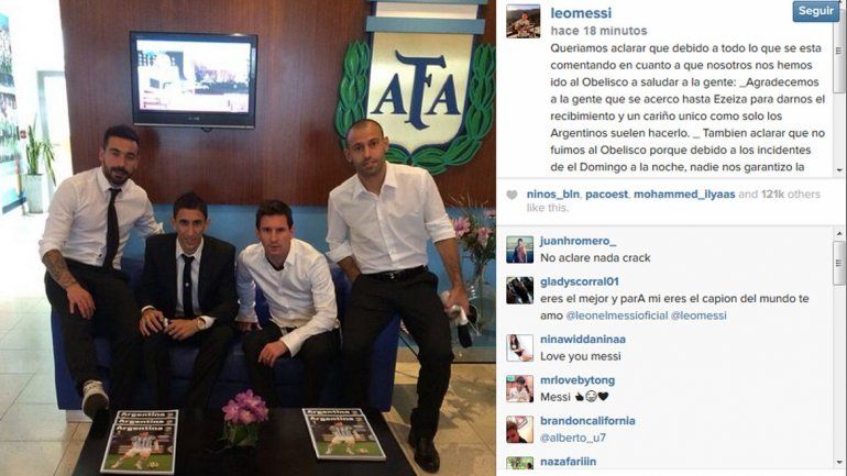 Sin embargo, los futbolistas del plantel argentino dieron una versión diferente a la de la AFA. El capitán, Lionel Messi, y los referentes Ezequiel Lavezzi y Javier Mascherano, difundieron un mensaje en las redes sociales, en el que explicaron que desistieron de ir al Obelisco porque "no estaba garantizada la seguridad".