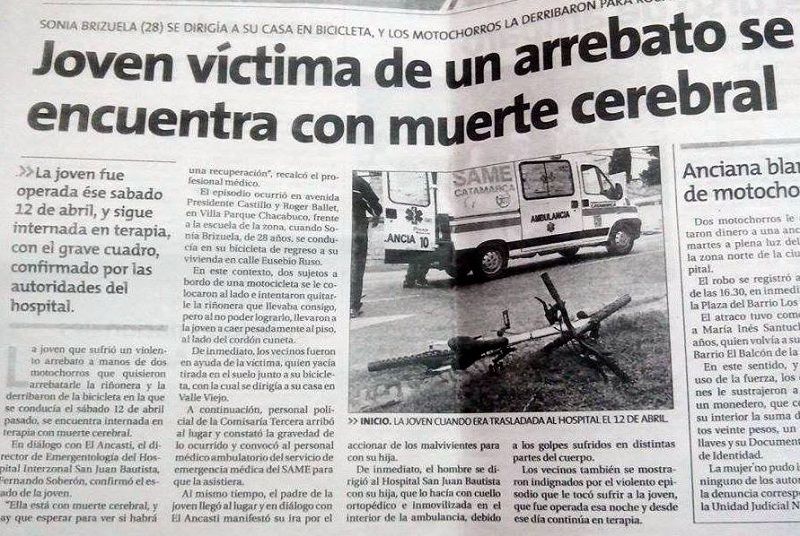 Los atletas Amigos del Jumeal también solicitan ayuda para acercar a Sonia Brizuela, una joven atleta, internada desde hace un mes, en estado de coma, en el Hospital San Juan Bautista de esta Capital. Tiene 28 años y quedó en coma en circunstancias de un robo y arrebato, cuando golpeó su cabeza en el cordón de la vereda.
