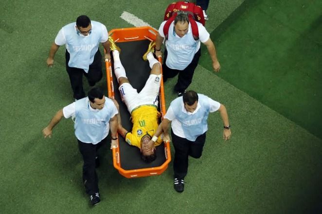 Neymar recibió un rodillazo en la espalda que le aplicó el lateral derecho colombiano Juan Zuñiga a los 43 minutos del segundo tiempo, lo que obligó a que el futbolista del Barcelona español fuera retirado en camilla del campo de juego y trasladado a un hospital de Fortaleza.