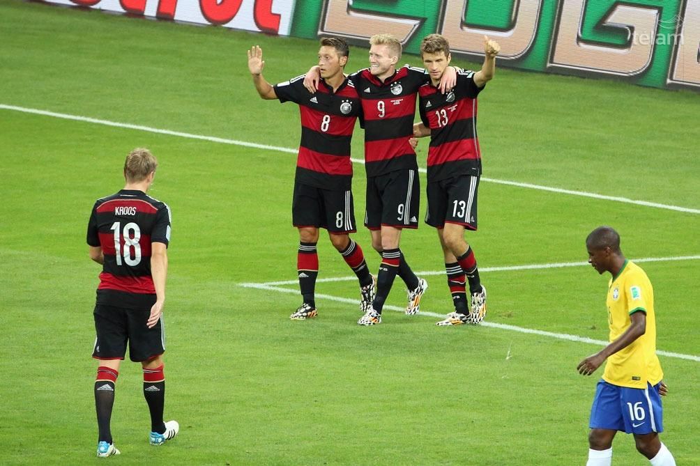 Antes de la media hora de juego, en un clima de absoluta estupefacción, los germanos destrozaron del modo más cruel el sueño del hexacampeonato con goles de Thomas Müller (11m.), Miroslav Klose (22m.), Toni Kroos en dos oportunidades (24m. y 25m.) y Sami Khedira (29m.).