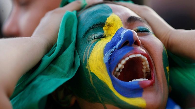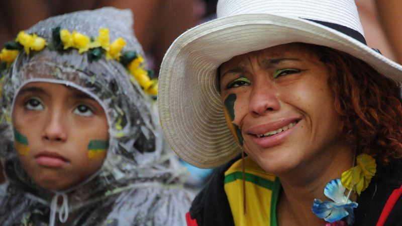 Llanto de la torcida y perplejidad en los jugadores brasileños. Los futbolistas de la selección brasileña muestran perplejidad ante lo que vivían en el primer tiempo del juego contra Alemania: cuatro goles en seis minutos, y goleada alemana 5 a 0. (Publicado en "O Globo" de San Pablo)