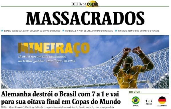 "Masacrados" y "Mineirazo", fueron los títulos del Folha de San Pablo, con Fernandinho abrazado a la red de uno de los arcos del estadio Mineirao.