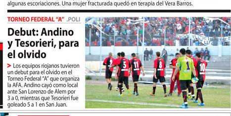 "Andino sufrió un duro traspié en su debut ante San Lorenzo”, publicó Nueva Rioja, señalando que "el ‘Tripero’ fue superado claramente por el equipo catamarqueño, que se impuso por 3 a 0 en el estadio de Vargas”.