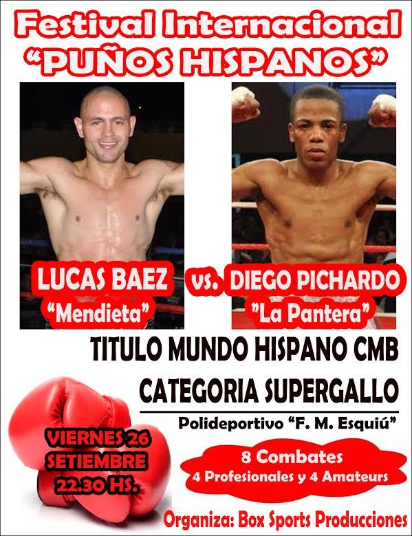 Con la pelea central entre el cordobés radicado en Catamarca Lucas "Mendieta” Báez (22-13-4 con 12 Ko) y el dominicano Diego "La Pantera” Pichardo Liriano (12-5-1 con 3 Ko), por el título Supergallo Mundo Hispano CMB, el espectáculo de los puños será presentado oficialmente este jueves 25, desde las 11 y en oficinas de la Secretaría de Turismo, Cultura y Deporte de la Capital, en el Club Social.