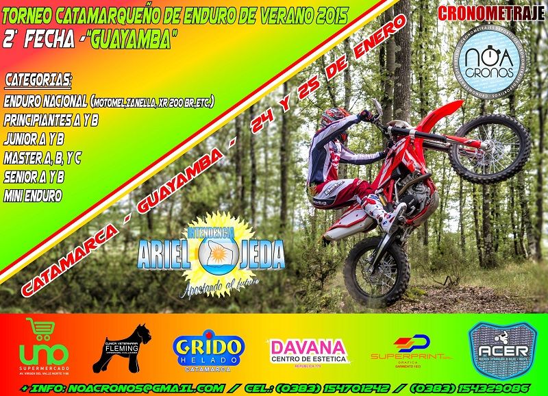 Este domingo, 25 de enero, la Asociación Catamarqueña de Enduro y Rescate, (ACER) hará disputar la 2da. fecha del Torneo Catamarqueño de Enduro de Verano 2015 en la Localidad de Guayamba, Dpto. El Alto, con la participación de pilotos de Santiago del Estero, Tucumán y de nuestra provincia.