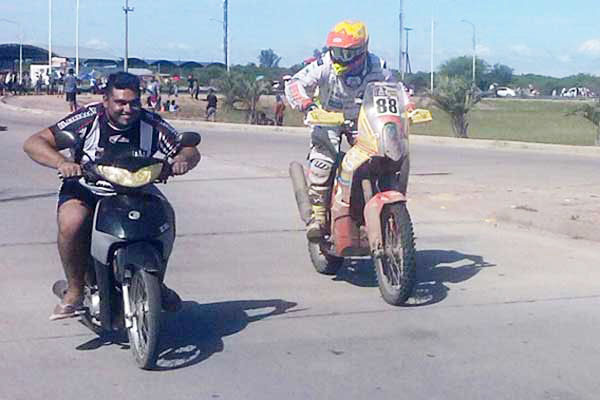 El hincha del Ferro subió a su cuenta de Facebook la foto y el video donde simula competir contra uno de los expertos en la categoría motos del raly más famoso del mundo, nada más y nada menos que Jasper Riezebos de Nueva Zelanda.