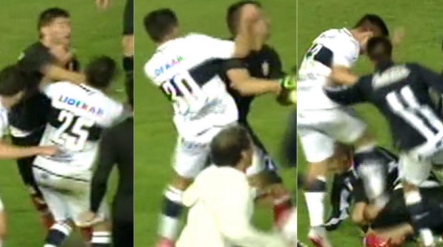 Durante la gresca en el campo, Andújar se trompeó con el atacante Nicolás Mazzola y tras caer al piso fue salvajemente agredido.