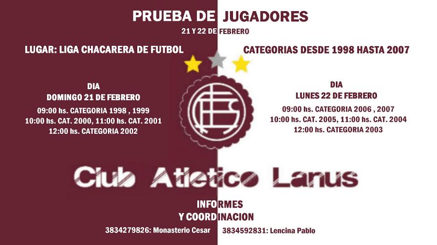 La prueba se llevará a cabo en la cancha de Liga Chacarera de Fútbol y estará a cargo de Enzo Portillo, perteneciente al Departamento de Captación del Club Atlético Lanús.