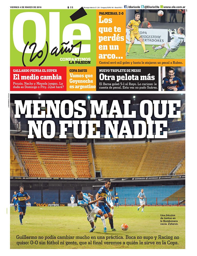 "Guillermo no podía cambiar demasiado en una práctica. Boca no supo y Racing no quiso: 0 a 0 sin fútbol, ni gente, que al final veremos a quien le sirve en la Copa”, cronicó el medio porteño, ilustrando con una foto a toda página del estadio "xeneize" sin gente y el epígrafe que alude a "una fricción de tantas en la Bombonera vacía”.