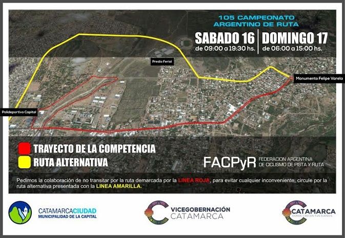 Cabe señalar que el sábado 16 y domingo 17, la actividad se cumplirá con largada y llegada en el Parque de los Niños, transitando de ida y vuelta hasta el monumento a Felipe Varela, en Villa Parque Chacabuco. En el regreso se accede a la costanera hasta adyacencias del Predio Ferial, pasando luego por el parque Adán Quiroga y el Polideportivo "Fray Mamerto Esquiú”.