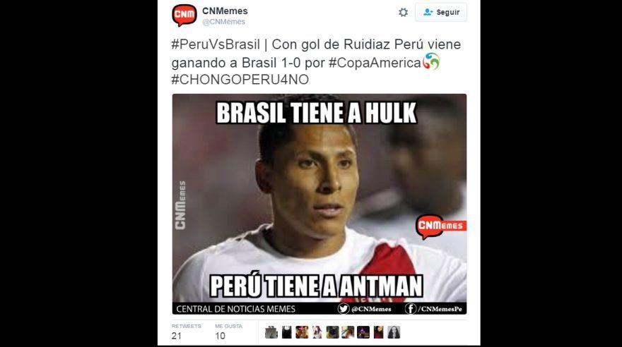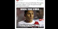 En un partido que mantuvo a peruanos y brasileños en vilo y con un gol que tardó en gritarse, las redes sociales reventaron en memes. Miles de usuarios peruanos de Facebook, Twitter y otras redes sociales compartieron divertidas imágenes.