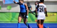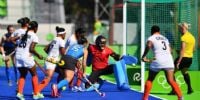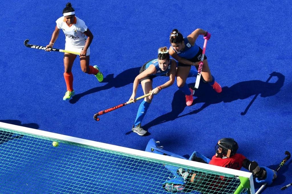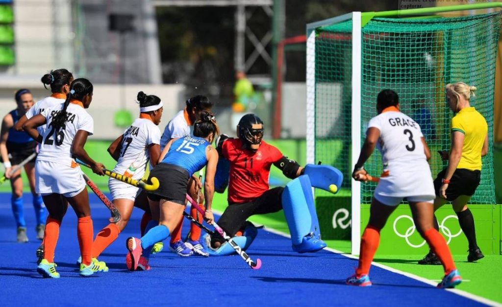 Thockchom, Poonam Rani y Vandana Katariya. Entrenador: Andrew Neil Hawgood.