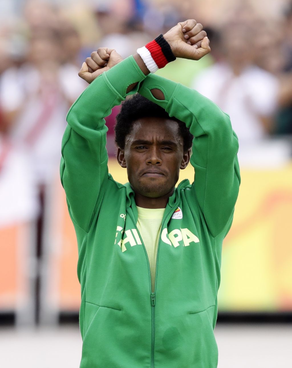 Al arribar a la meta después de haber recorrido los 42,195 kilómetros de la tradicional prueba atlética, el corredor africano otorgó un elocuente gesto de rechazo hacia las autoridades de su país, cruzando sus brazos y remedando a una persona presa.