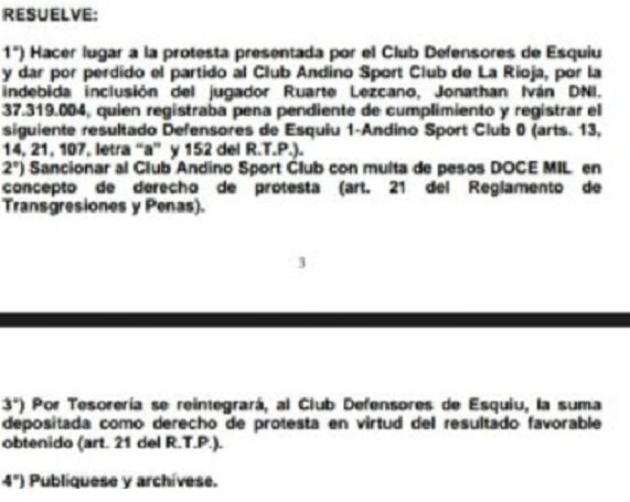 Además de otorgarle los tres puntos reclamados, con el resultado 1-0 a favor de Defensores, el TDI dispuso el reintegro a la tesorería "Sagrada” de los $ 12.000 que había