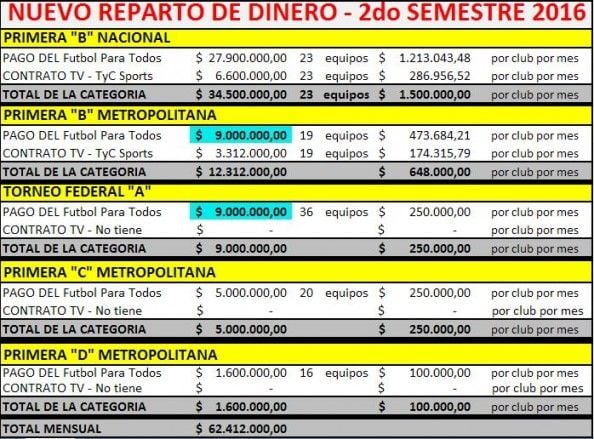 La 1ran. B Metropolitana y el Federal "A" percibirán $ 9.000.000. En el caso de esta última, se divide por