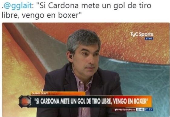 El culpable, claro, fue golazo de Cardona, un derechazo de novela que sirvió para abrir el Súper. Y también para que Glait se convirtiera casi en trending topic en redes sociales. La captura de pantalla con su promesa se viralizó. Y también el anuncio de miles de personas avisando que este lunes, a partir de las 19, van a prenderse al televisor para ver si cumple o no el desafío.