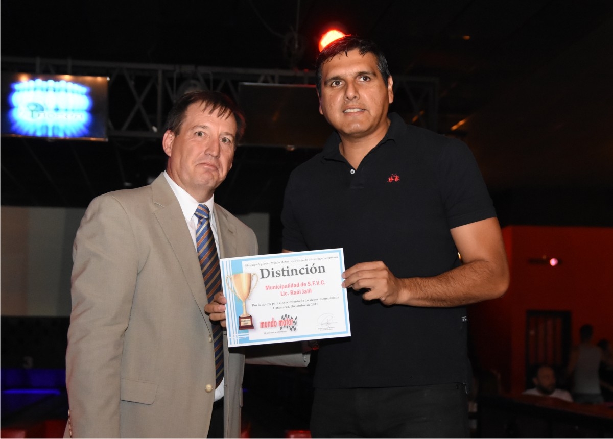 Municipalidad de San Fernando del Valle de Catamarca por permitirnos vivir un año más el Rally Cross Nacional, el trabajo del Señor Intendente, Raúl Jalil y su equipo nos permitió disfrutar de una competencia espectacular con un gran marco de público, además la Municipalidad de la Capital tuvo mucho que ver con la llegada del Gran Premio Argentino Histórico a nuestra provincia. La distinción fue recibida por el Secretario de Gobierno de la Municipalidad, Dr. Hernán Martel quien fue acompañado por el Secretario de Turismo, Gustavo Oviedo.