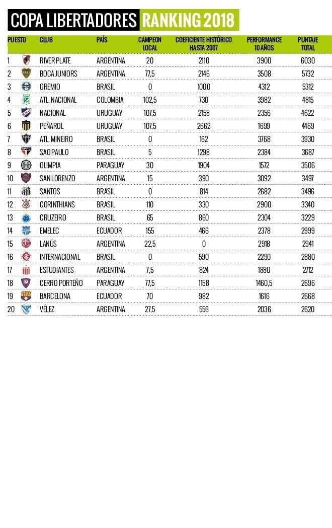 En este nuevo ranking dado a conocer por Conmebol, las principales posiciones son éstas: 1) River. 2) Boca. 3) Gremio. 4) Atlético Nacional de Medellín (nuevo club de Jorge Almirón). 5) Nacional de Montevideo. 6) Peñarol. 7) Atlético Mineiro. 8) San Pablo. 9) Olimpia. 10) San Lorenzo.