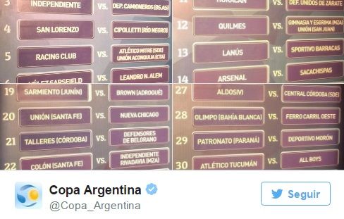 Asimismo, en otros partidos atractivos, San Lorenzo se medirá con Cipoletti de Rio Negro y Racing tendrá que esperar por el ganador de la eliminatoria entre Atlético Mitre (Santiago del Estero) o Unión Aconquija (Catamarca).