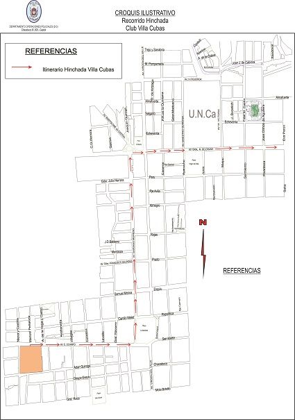 Teniendo en cuenta este evento deportivo, el personal policial afectado para tal fin custodiará la hinchada del Club Sportivo Villa Cubas, desde la salida de su sede ubicada en la Av. Ocampo, continuando por Av. Mariano Moreno, ronda Gral. Martin Miguel de Güemes, Av. Belgrano, Av. Alem Norte, Avenida Recalde, calle Capitan Salas, Avenida Pte. Castillo, calle Juan P. Vera, calle Padre Esquiú y Calle del Deporte hasta la liga Chacarera futbol.