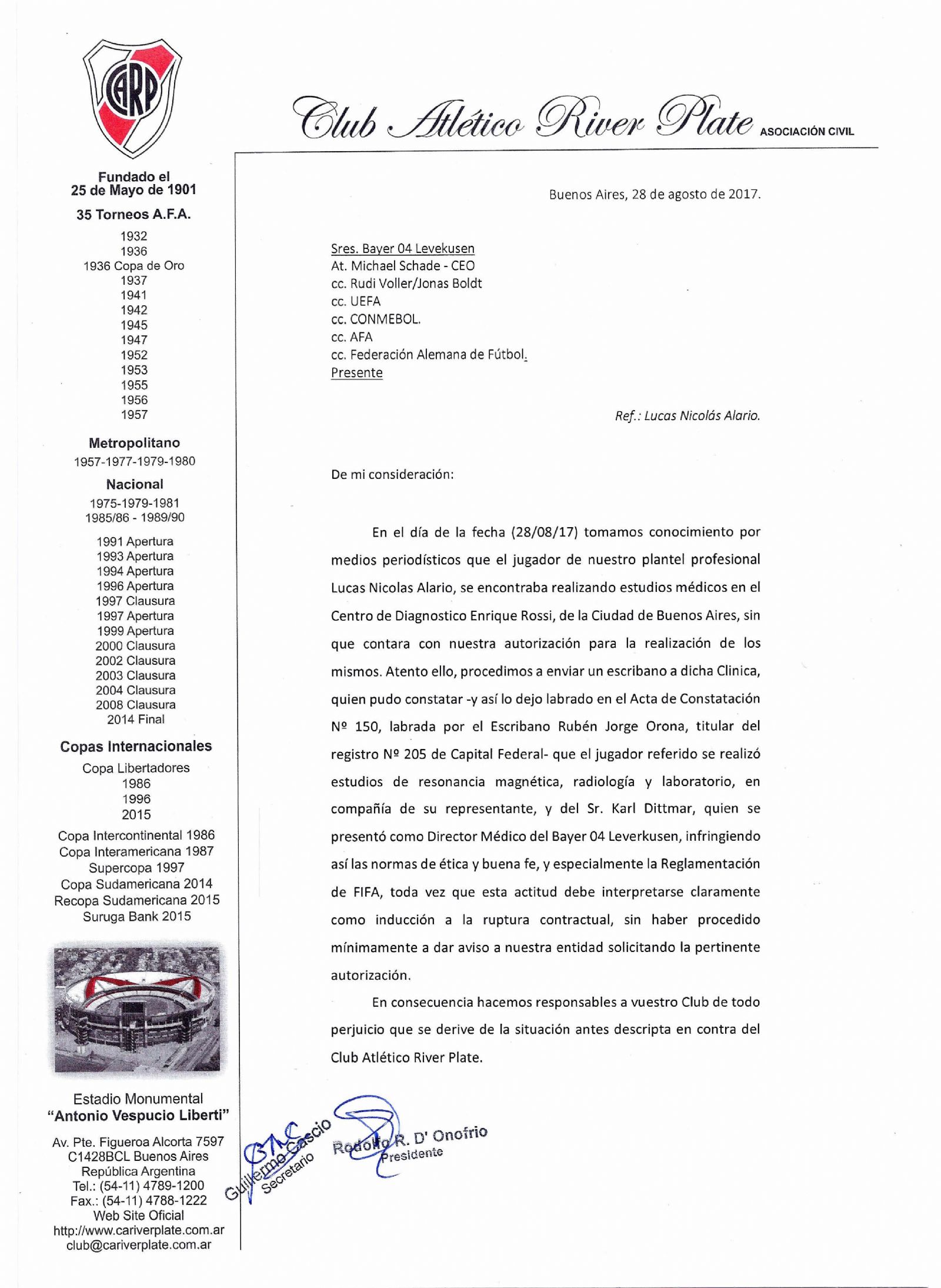 A través del comunicado, River también da a entender que podría tomar medidas disciplinarias contra Alario porque considera una falta de ética lo que hizo sin permiso, pero además intima al Bayern para que desistan de su accionar para que este caso no llegue a los tribunales deportivos de la FIFA.