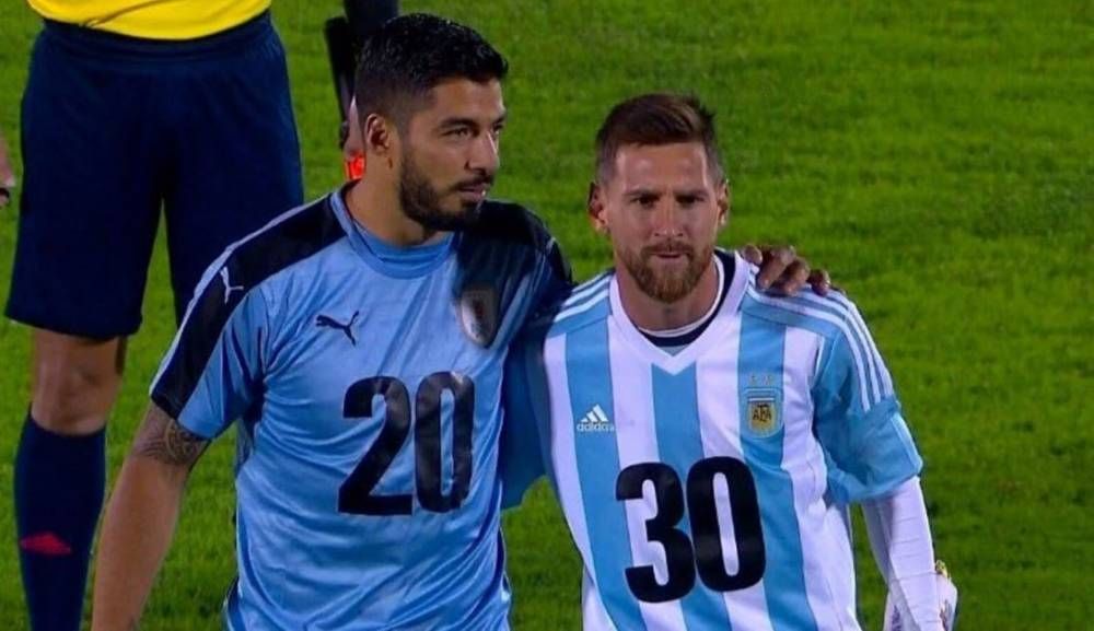 Lionel Messi y Luis Suárez salieron al campo de juego del Estadio Centenario con sendas camisetas de sus respectivas selecciones pero con alusiones al Mundial 2030, que tanto Argentina como Uruguay quieren organizar en forma conjunta junto a Paraguay, que se unió a último momento.
