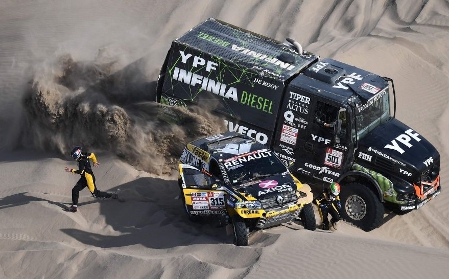 La foto es tan buena que por sí sola dice muchas cosas. La imagen que un fotógrafo de la Agencia AFP tomó en la cuarta etapa es para varios especialistas la mejor de la carrera hasta el momento. En la misma se observa el camión Iveco que maneja el cordobés Federico Villagra acelerando a fondo por las dunas y haciéndole un “finito” muy peligroso a la Duster que pilotea el portugués Carlos Sousa.