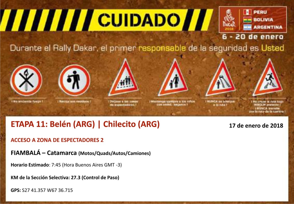Acceso: EN LA CIUDAD DE FIAMBALÁ AL ESTE DE LA POBLACIÓN SE ENCUENTRA EL PASO DEL RIO QUE LA BORDEA, LA CARRERA CORRE POR EL CAUCE DEL RIO SECO, EL ACCESO A LA ZONA DE ESPECTADORES SERÁ A LA ALTURA DEL PUENTE QUE LLEVA A LAS TERMAS.