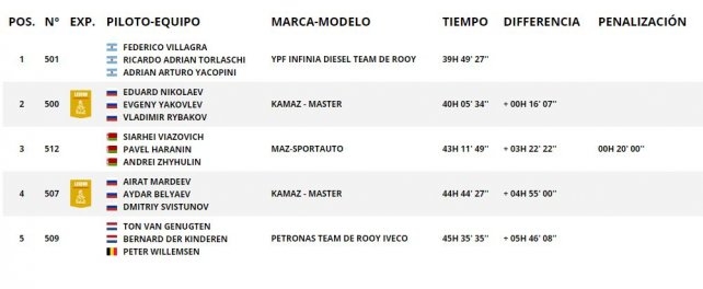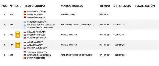 El piloto de Córdoba pudo finalizar la especial detrás del checo Siarhei Viazovich (Maz) a solo 1 minuto 24 segundos, pero le sacó más de 40 minutos a Nikolaev, por lo que lo desplazó del primer lugar.