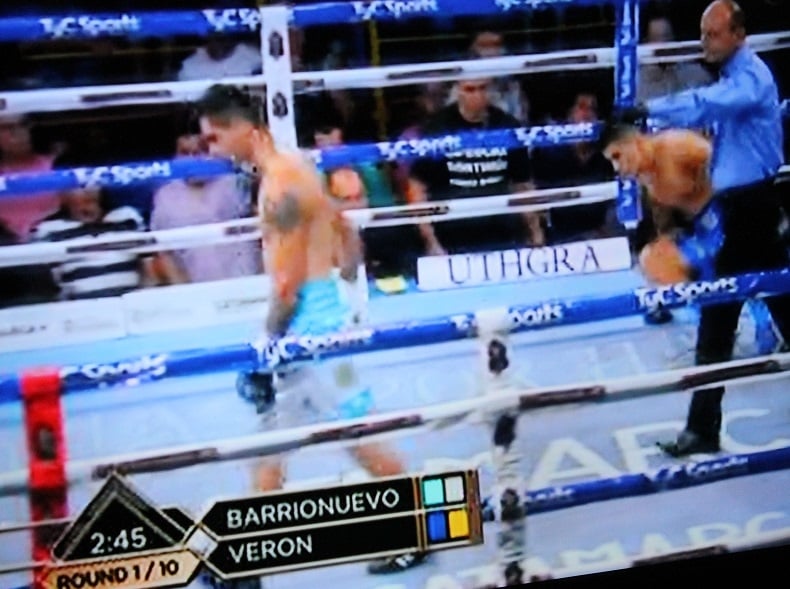 Salvo por la contundente y efectiva definición, el combate no tuvo mayores acciones para analizar dado el fulminante desenlace del pleito en favor de Barrionuevo (66,600 Kg.), que en menos de tres minutos mandó dos veces a la lona a Verón (66,300 Kg.), para dejarlo literalmente “clavado” en el tapiz, mientras intentaba vanamente recuperar la vertical.